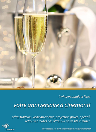 Nous ne connaissons pas précisément les films qui seront à l’affiche plus d’une semaine à l’avance, ni les séances ou même les salles. Nous pourrons vous communiquer ces informations le lundi précédent votre anniversaire. Pour les films en 3D un supplément de 2.- par personne est demandé. Les personnes qui n’ont pas de lunette 3D peuvent en acheter au prix de 3.- CHF
